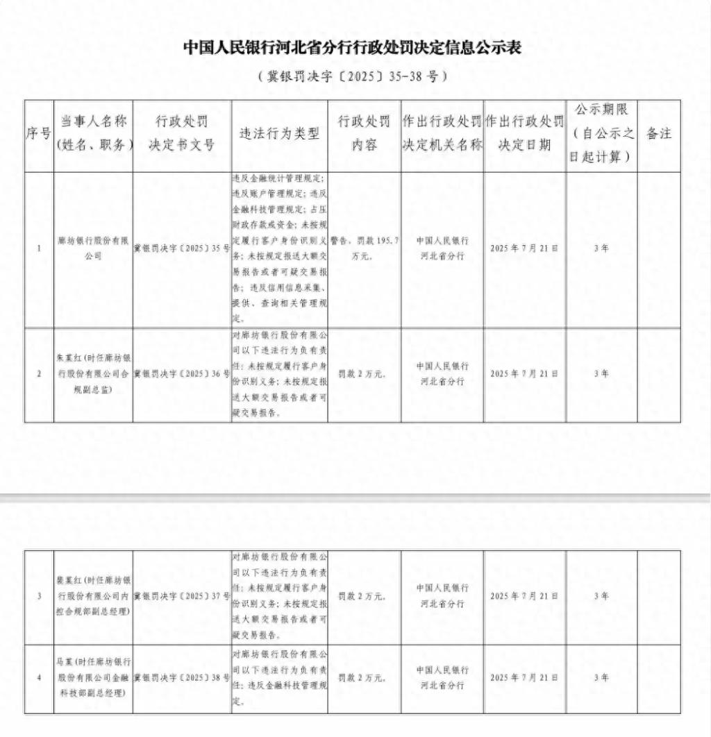 7月30日,中国人民银行河北省分行挂出四则行政处罚决定书,因存在多项违法行为,廊坊银行被警告,并被罚款195.7万元。