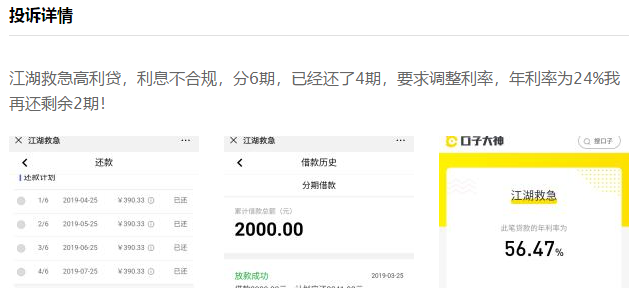 2019年8月26日,李女士在聚投诉发帖称,其在江湖救急微信公号申请借款2000元(放款时间为2019年8月16日),分6期偿还(际分6期还款),却需还款2341.98元。