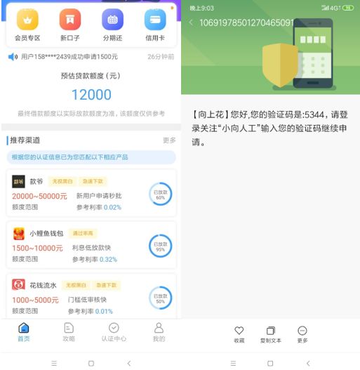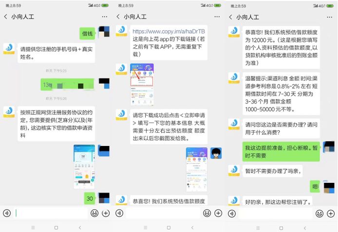 因为小编忽略了短信提示,大概10分钟之后,向上花方面打来电话提示,推荐的贷款渠道不合规,利率都很高,基本都是借2500元,还4000元,期限是6天,请关注微信公众号“小向人工”继续申请借钱。