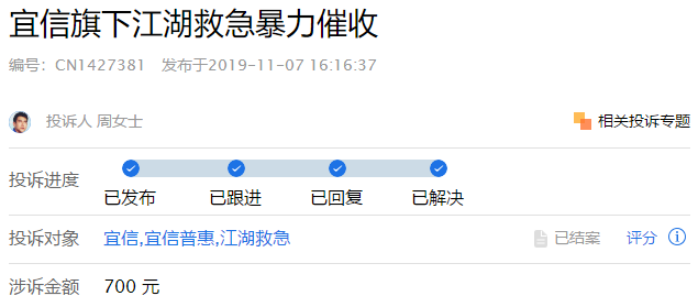 2019年11月7日,周女士在聚投诉发帖称,宜信旗下江湖救急暴力催收。