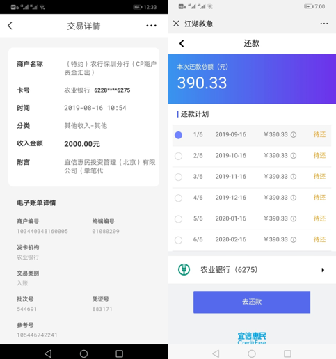 根据李女士贴出的截图,交易详情显示,附言为宜信惠民投资管理(北京)有限公司,还款计划为6期,每期偿还390.33元,应还金额详情显示,390.33元包含本金326.42元、利息16.75元、服务费20.05元,以及担保费27.11元。