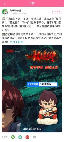9月21日,有妖气B站官方账号发布一条预告消息,称镇魂街数字手办将于次日中午12点通过蚂蚁链限量发行。 这是镇魂街首次试水数字收藏品。