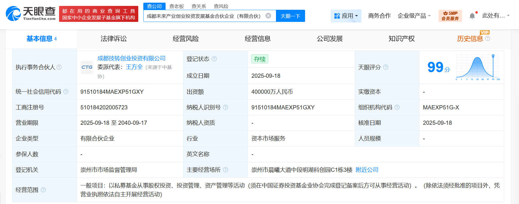 天眼查App显示,近日,成都未来产业创业投资发展基金合伙企业(有限合伙)成立,执行事务合伙人为成都技转创业投资有限公司,出资额40亿人民币,经营范围含以私募基金从事股权投资、投资管理、资产管理等活动。