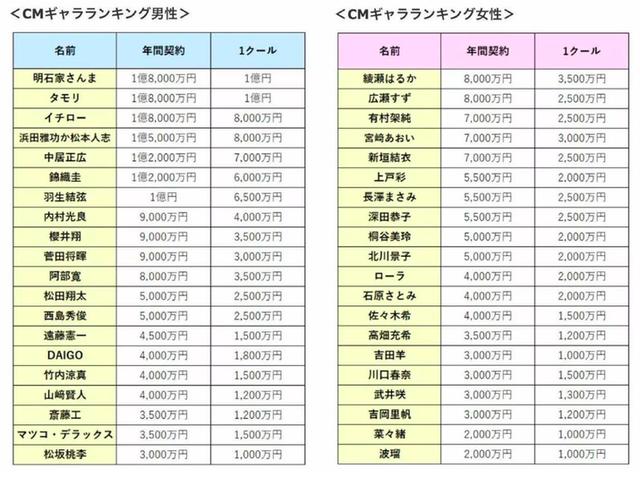 日本演员通常电视剧报价低,广告报价高,通过电视剧积攒人气,广告是主要收入。以下是日本演员的广告签约费报价,分类是一年代言与单条广告。