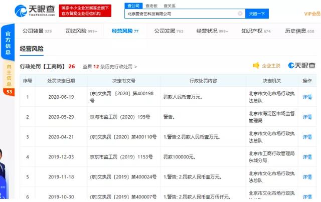 除了这些,还有外部环境,也影响着爱奇艺的发展,如面临的监管审查问题,根据天眼查显示,爱奇艺面临的行政处罚有26条,多为文化监管部门处罚。