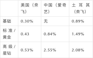 表1 奈飞、爱奇艺会员价格占各国月人均可支配收入占比 另外,爱奇艺的黄金会员价格占人均可支配收入比为1.3%,可以拿爱奇艺的会员价对比一下奈飞的会员价格。