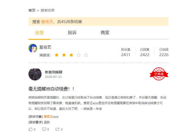 有趣的是,爱奇艺降低会员价格推出的连续包月、包年业务,在各大消费投诉平台留下身影,以黑猫投诉为例,有关爱奇艺的投诉有4528条,多是有关会员续费问题。