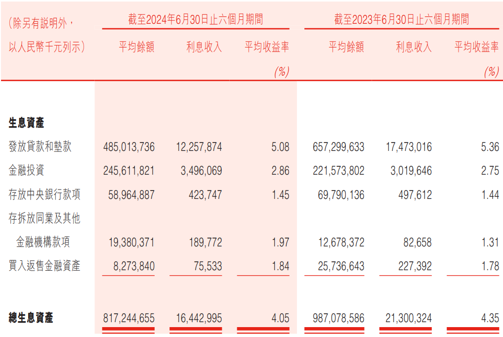 而平均收益率远小于贷款的金融投资平均余额2456亿元,占比由2023年末的25%升至2024年6月末的30。