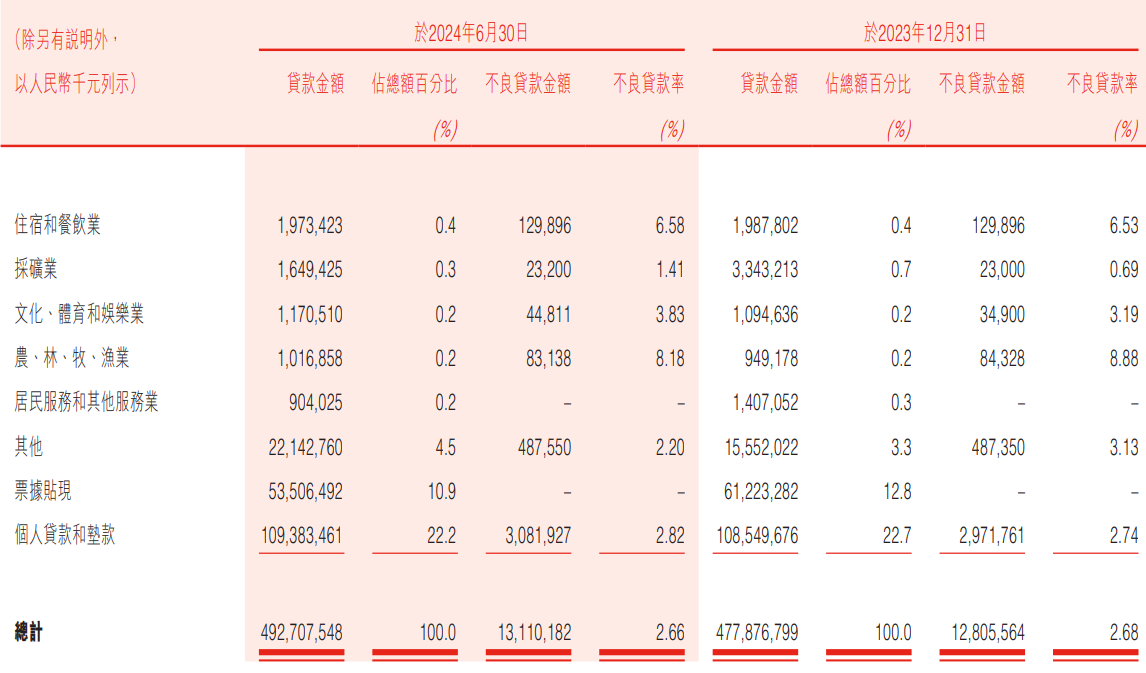 企业贷款不良率最高的五个行业分别为:农、林、牧、渔业8.18%,住宿和餐饮业6.58%,批发和零售业4.85%,文化、体育和娱乐业3.83%,制造业3.05%,贷款合计占企业贷款42%。