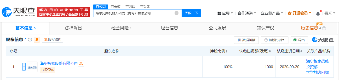 天眼查App显示,近日,海尔兄弟机器人科技(青岛)有限公司成立,法定代表人为丁来国,注册资本1000万人民币,经营范围含智能机器人销售、工业机器人销售、特殊作业机器人制造、人工智能硬件销售、人工智能应用软件开发、人工智能基础软件开发等,由海尔智家(600690)全资持股。