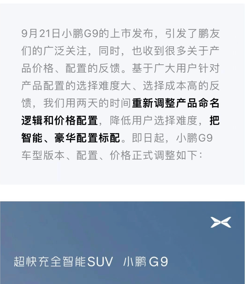 然而,正在过弯的小鹏近期遇到了各种问题。小鹏G9一上市就遭遇了危机,作为小鹏的第四款量产车型,G9担着小鹏冲击高端、提升毛利的重任,却因为混乱的配置受到内外质疑,最终导致新车刚发布2天就大改配置单和价格的罕见场面。