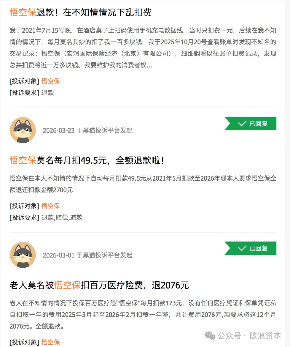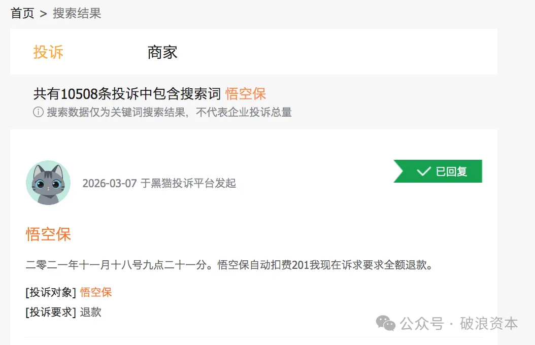 破浪资本调查发现,张先生的遭遇并非个例,黑猫投诉平台数据显示,针对悟空保的投诉量已突破万条,数万消费者被其“隐形扣费”套路收割,而这一切,发生在悟空保被监管处罚、承诺全面整改四年之后。