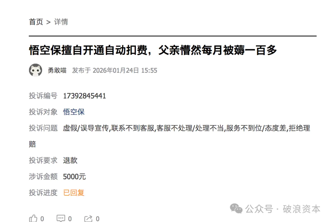 黑猫投诉平台上,涉及“悟空保”的投诉破万,破浪资本梳理大量投诉案例发现,悟空保的“收割套路”极具隐蔽性,且精准瞄准中老年人等群体,核心围绕“低价引流+隐形续费”展开,与行业内被诟病的“魔方保险”营销模式高度契合。