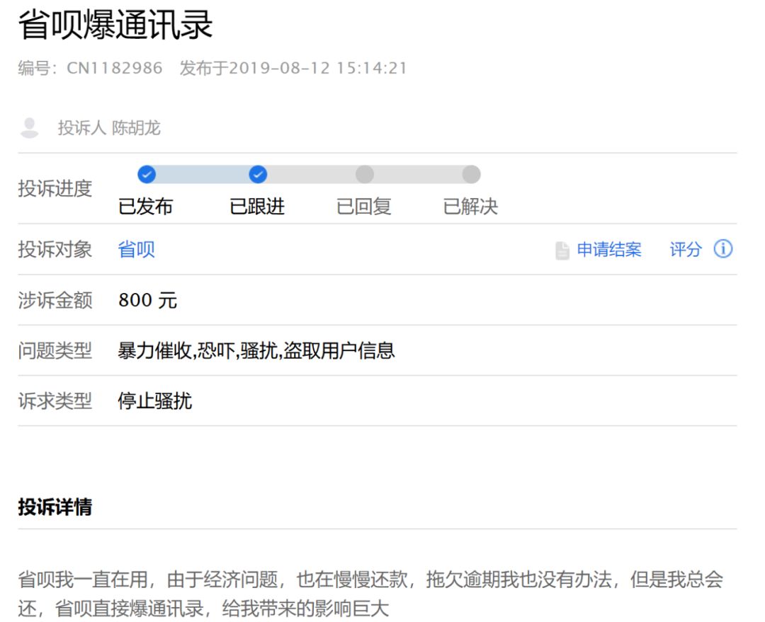 投诉人陈先生反映称,“省呗”工作人员在他逾期之后,直接爆掉了他的通讯录,造成了恶劣影响。