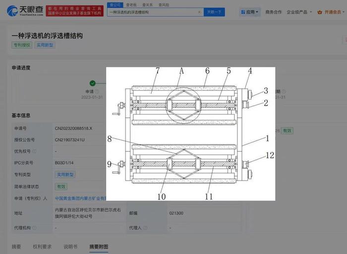 天眼查知识产权信息显示,涉事公司中国黄金集团内蒙古矿业有限公司于2023年申请的“一种浮选机的浮选槽结构”专利获授权。摘要显示,本实用新型公开了一种浮选机的浮选槽结构,包括槽体、刮沫板和旋转刮沫片,所述槽体的顶部两侧均安装有一个旋转空腔,所述旋转空腔的外侧两端均安装有一个旋转刮沫片,所述旋转空腔的内部安装有丝杆,且丝杆的两端均套设有有个螺纹滑块,且两个螺纹滑块内部的螺纹方向相反,所述旋转刮沫片的外侧均套设有一个刮沫板,所述螺纹滑块的两端均延伸出旋转空腔的内部,且螺纹滑块的两端滑动安装在旋转空腔的外侧。本实用新型通过两个螺纹滑块的相对移动可以控制刮沫板上下往复运动,由于刮沫板套设在旋转刮沫片的外侧,刮沫板可以在旋转刮沫片的外侧进行上下往复运动,会将旋转刮沫片表面沾染的矿物泡沫刮下,保持旋转刮沫片表面的整洁度。