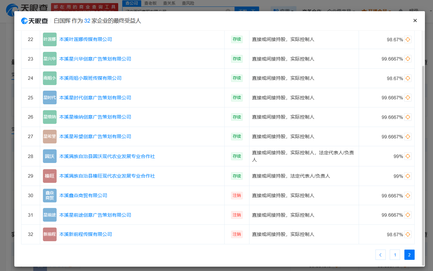 天眼查任职信息显示,东北雨姐(常小雨)名下仅辽宁雨姐电商直播孵化基地有限公司、忠县辰辉文化艺术工作室(个体工商户)为存续状态。 东北雨姐丈夫白国辉名下关联5家存续企业,通过直接或间接持股,白国辉拥有32家企业的实际控制权。近期,白国辉实控的本溪星前途创意广告策划有限公司等公司接连注销。此外,去年11月,白国辉实控的本溪叶莲娜传媒有限公司、本溪星未来创意广告策划有限公司等多家公司曾申请简易注销后又撤回。