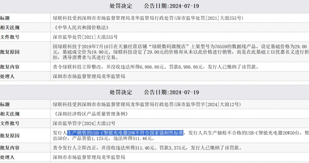 2022年、2024年,深圳市监局也多次对绿联科技开出罚单,原因包括其生产销售的USB-C智能充电器20W不符合国家强制性标准、抽检不合格、虚标价格等。