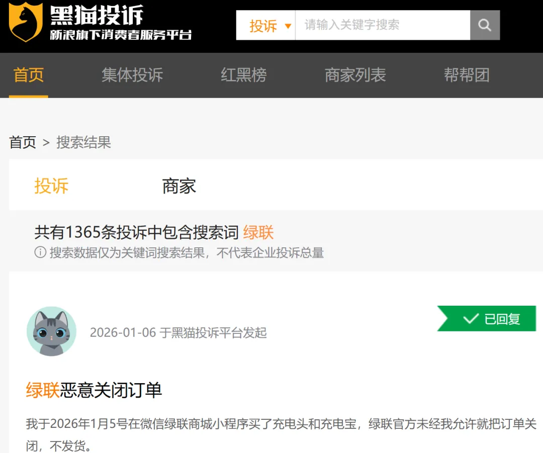 目前黑猫平台上,关于绿联的投诉已达1365条,涉及质量问题、恶意关闭订单等服务问题。