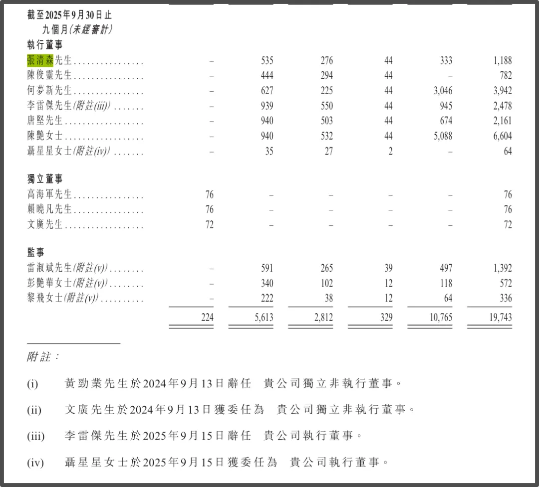 招股书披露了一个耐人寻味的细节:两位创始人——张清森与陈俊灵,在公司执董薪酬中排名倒数第二和倒数第三。