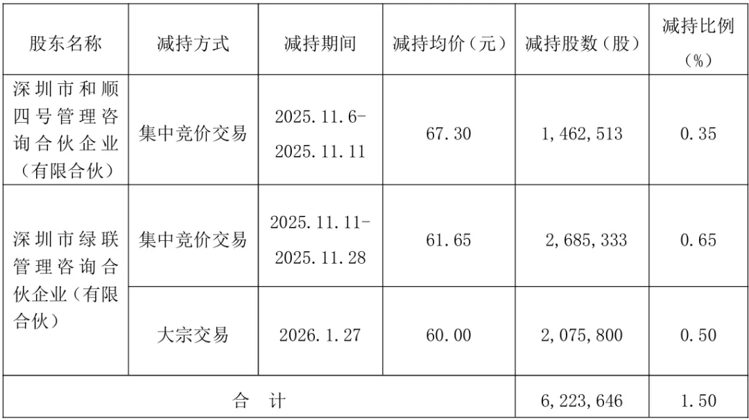 绿联科技公告显示,绿联管理咨询及其一致行动人和顺四号自2025年11月6日至2026年1月27日,通过集中竞价与大宗交易方式,合计减持622.36万股,占总股本约1.5%。据《星岛》粗略计算,套现金额高达3.89亿元。