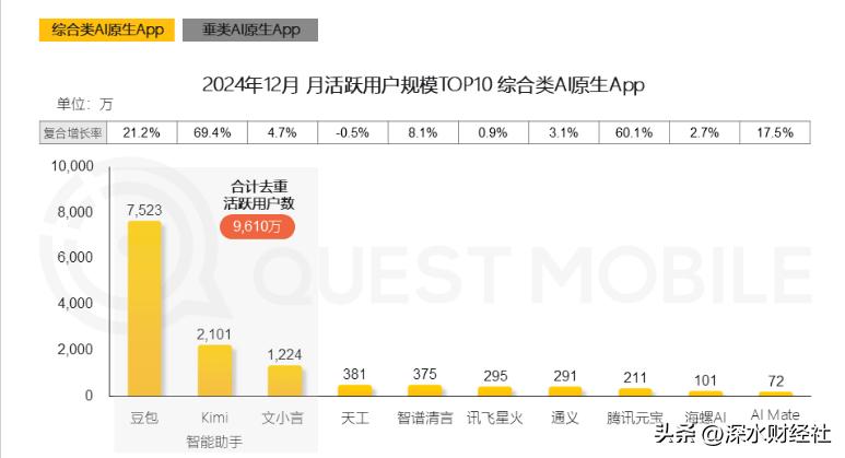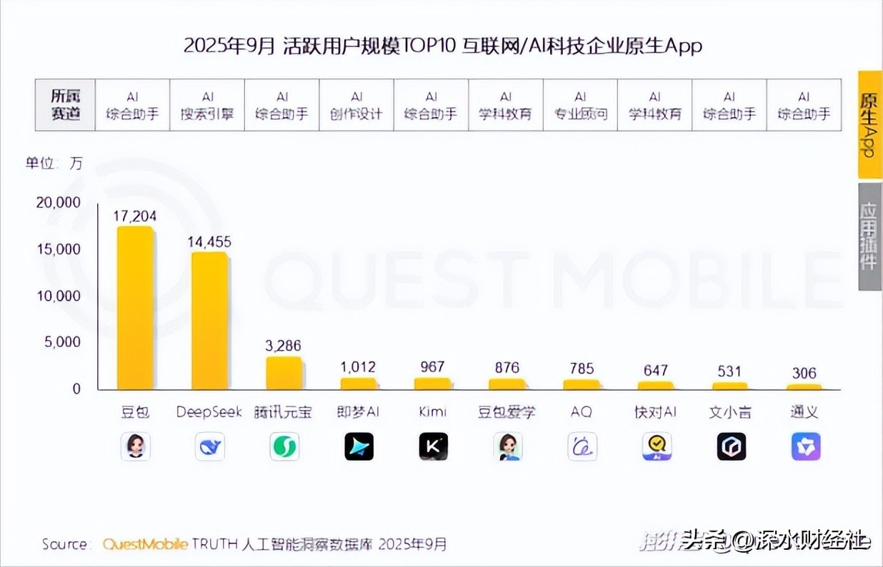 2025年9月,QuestMobile发布的报告显示,文心一言当月月活跃用户仅为531万,在国内原生AI应用中处于尾部位置。同期,豆包月活达1.72亿,DeepSeek以1.45亿位列第二,即便是腾讯元宝、Kimi等产品的月活也远超文心一言。