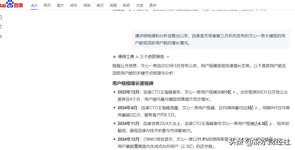 -2024年6月28日,百度CTO王海峰在开发者大会上宣布,文心一言累计用户突破3亿,日调用次数同步增至5亿次,半年内用户规模增长超3倍。