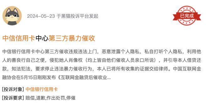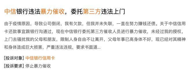 在黑猫投诉中搜索中信信用卡,催收占了很大一个比例。催收中,使用第三方暴力催收又格外刺眼。不少消费者直言, “ 第三方催收违规上门,恶意泄漏个人隐私......上门骚扰我的父母和朋友,限制人身自由不让离开,对年事已高的父母精神与身体造成巨大损害.......”