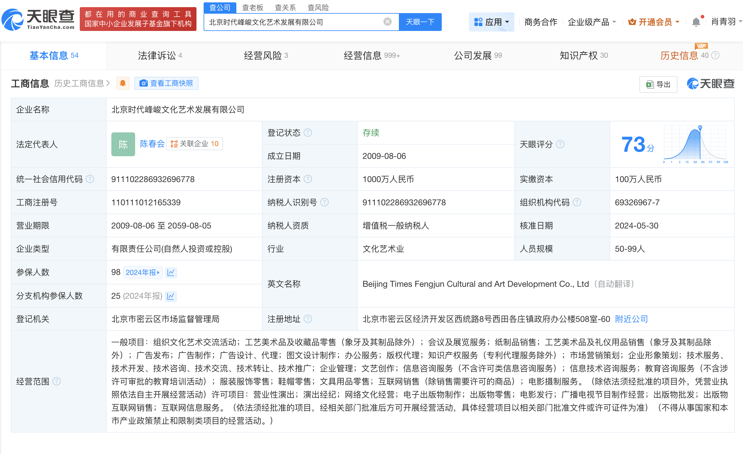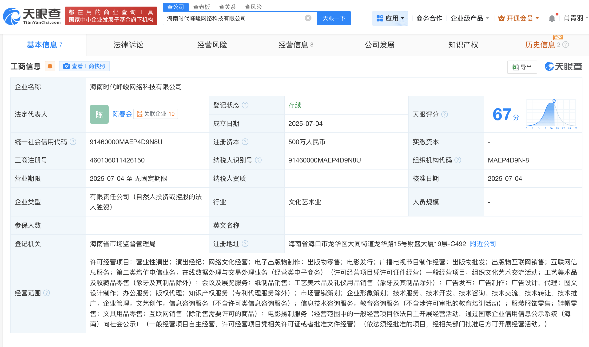 天眼查App显示,近日,北京时代峰峻文化艺术发展有限公司在海南成立海南时代峰峻网络科技有限公司,法定代表人为陈春会,注册资本500万人民币,经营范围包括营业性演出、演出经纪、网络文化经营、电子出版物制作、出版物零售等。