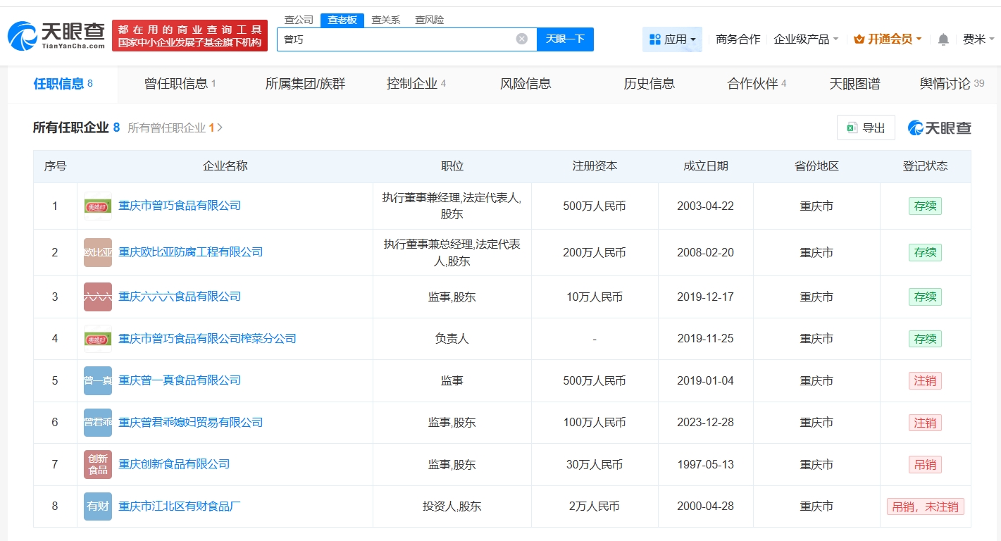 天眼查任职信息显示,曾巧名下关联8家企业,其中4家企业处于存续状态,包括乖媳妇鸡爪关联公司重庆市曾巧食品有限公司、重庆欧比亚防腐工程有限公司等,曾巧在乖媳妇鸡爪关联公司担任执行董事兼经理、法定代表人并持有该公司股份,其他4家企业已注销或被吊销。