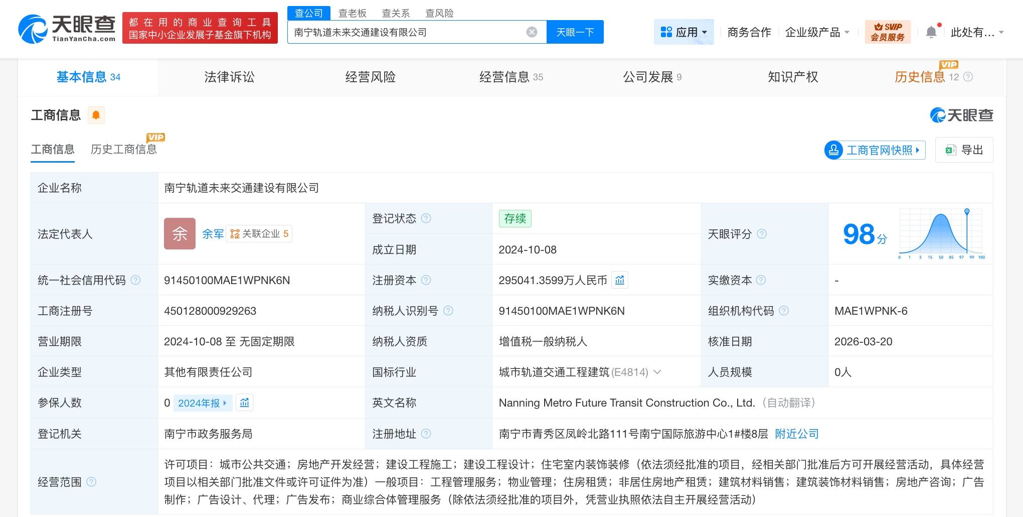 南宁轨道未来交通建设有限公司成立于2024年10月,法定代表人为余军,经营范围包括城市公共交通、房地产开发经营、建设工程施工、建设工程设计、工程管理服务、物业管理等。股东信息显示,该公司由南宁轨道交通投资集团有限公司、南宁市人民政府国有资产监督管理委员会及南宁轨道交通集团有限责任公司共同持股。