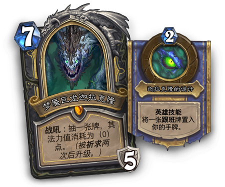 所有巨龙的终结者迦拉克隆将化身成为五张全新的英雄牌,分别对应战士、术士、萨满祭司、潜行者和牧师。各职业的迦拉克隆都会拥有强大的战吼和英雄技能。但是,刚刚苏醒的纳迦克隆仍未完全恢复力量,而怪盗军团也需要巨龙信徒的帮助,向纳迦克隆虔诚“祈求”,才能充分唤醒他的力量。