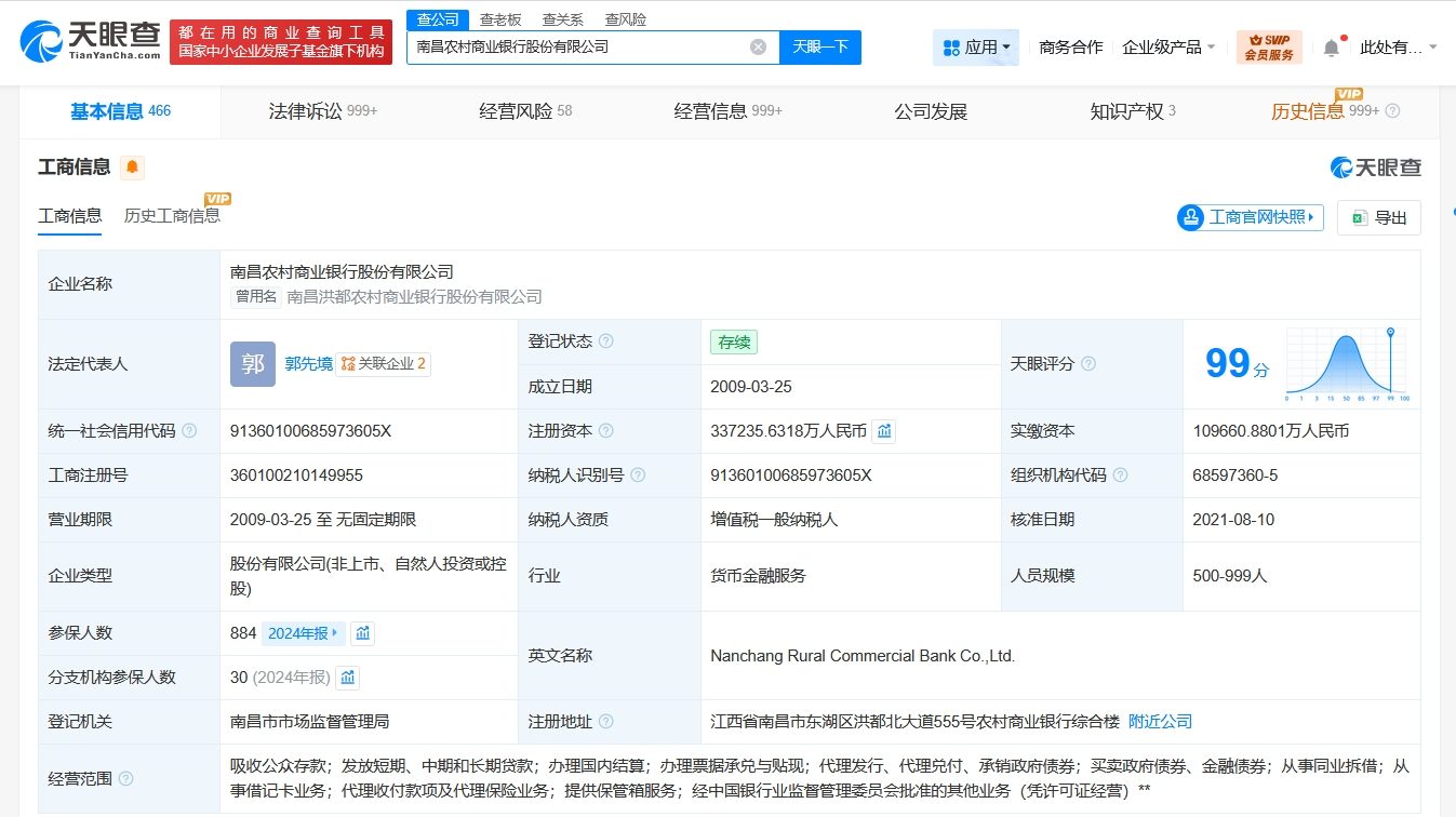 该公司成立于2009年3月,法定代表人为郭先境,经营范围为吸收公众存款,发放短期、中期和长期贷款,办理国内结算,办理票据承兑与贴现,代理发行、代理兑付、承销政府债券,买卖政府债券、金融债券等。股东信息显示,该公司由泰豪集团有限公司、江西汇仁集团医药科研营销有限公司、江西新蓝天房地产开发有限公司等共同持股。