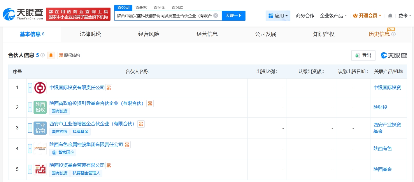天眼查App显示,近日,陕西中赢兴盛科技创新协同发展基金合伙企业(有限合伙)成立,执行事务合伙人为中银国际投资有限责任公司、陕西投资基金管理有限公司,出资额10亿人民币,经营范围为以私募基金从事股权投资、投资管理、资产管理等活动,由中银国际投资有限责任公司、陕西省政府投资引导基金合伙企业(有限合伙)、西安市工业倍增基金合伙企业(有限合伙)、陕西有色金属控股集团有限责任公司、陕西投资基金管理有限公司共同出资。