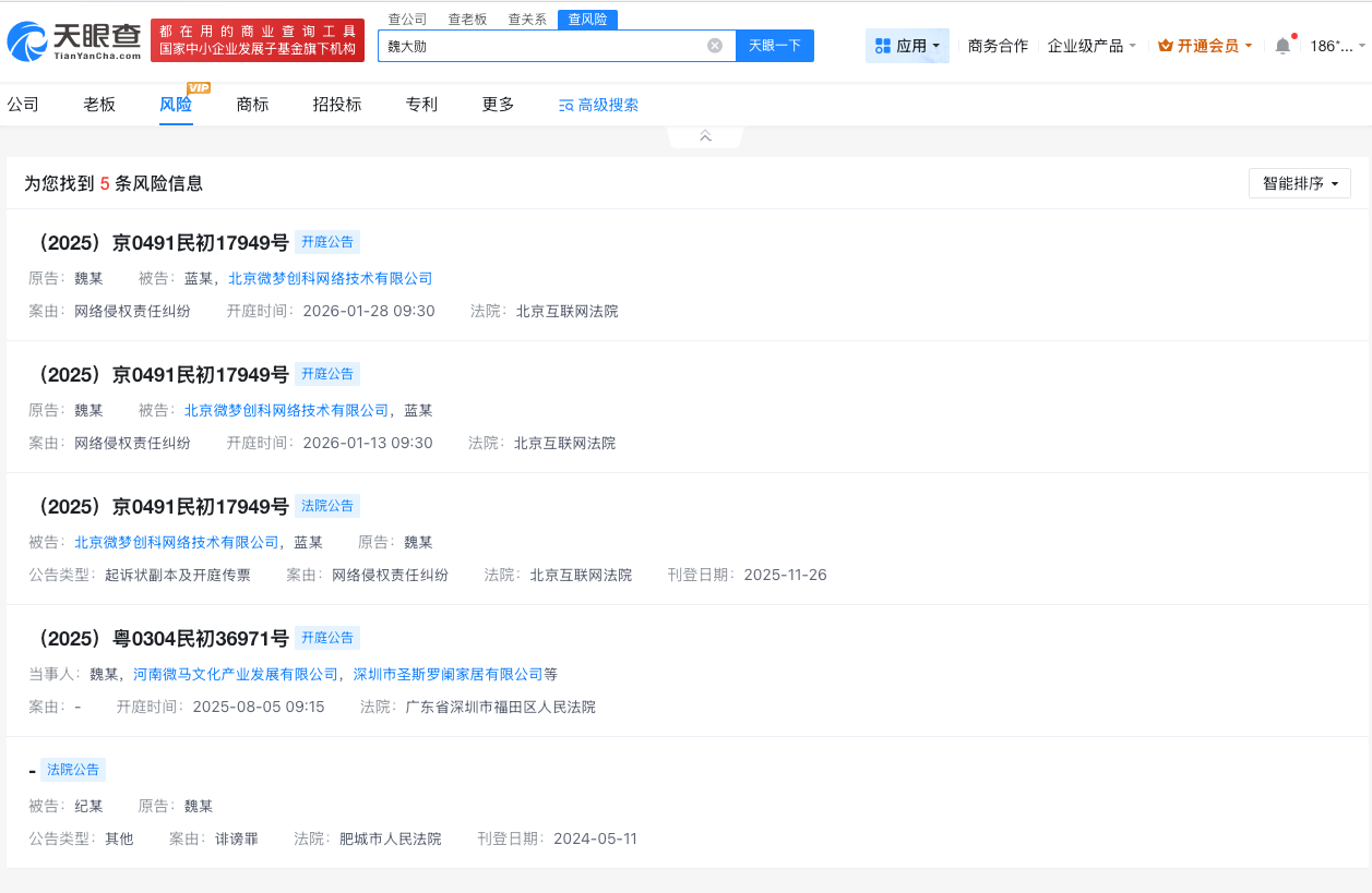 天眼查法律诉讼信息显示,此前,魏大勋已多次发起网络侵权责任纠纷等维权案件,被告涉及多个自然人及公司。其中,魏大勋与蓝某相关网络侵权责任纠纷案件曾定于2026年1月28日开庭审理。此外,纪某曾因严重侵犯魏大勋名誉权、肖像权向其公开道歉。