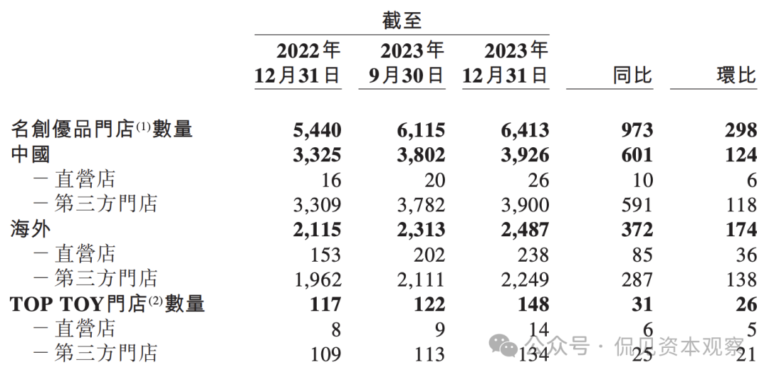 业绩的增长,主要来自于规模的扩张,根据财报显示,截至2023年末,名创优品的门店数量为6413家,同比增长973家。其中,中国地区门店数量为3926家,同比增长601家;海外门店数量为2487家,同比增长372家。