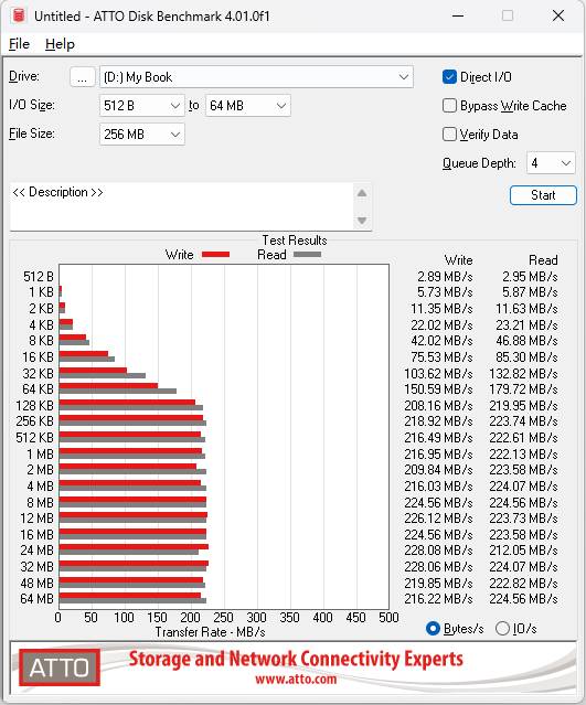 在日常使用中,除了大文件的传输,用户还需要频繁处理各种零碎小文件。为了测试硬盘在这一场景下的表现,我们使用了ATTO软件。测试结果显示,西数My Book™台式硬盘在拷贝128KB以上数据级文件时,读取速度稳定在219MB/s以上,写入速度也能维持在208MB/s。这表明硬盘在处理零碎文件时同样表现出色,能够快速响应用户的操作需求,不会出现卡顿或延迟的情况。