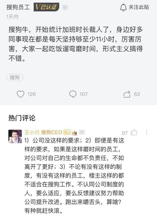 新浪科技讯 4月4日下午消息,今日有自称搜狗员工曝料称,搜狗开始统计加班时长裁员了,身边很多同事每天坚持够至少11个小时。爆料称,许多员工吃饭遛弯磨时间,来达到加班时长的要求,并称此种为“形式主义”。随后,搜狗CEO王小川评论称,“公司没这样的要求。”