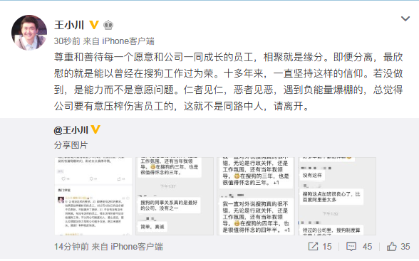 王小川随后在微博上也发布了该言论,并用截图佐证搜狗文化建设做得好。