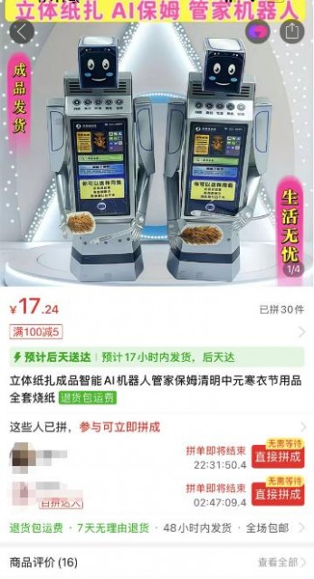 【TechWeb】4月4日消息,清明节将至,继前两年纸扎iPhone、折叠屏手机、扫地机器人在祭祀市场走俏之后,今年清明的“赛博祭品”又迎来了一次全面的AI化升级。而这一次,AI大模型和智能机器人成了新晋顶流。