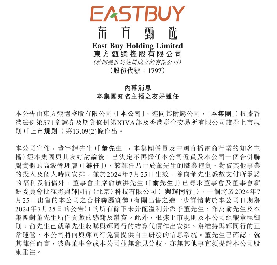 【TechWeb】7月25日消息,东方甄选在港交所公告,董宇辉已决定不再担任公司雇员及公司一个合并联属实体的高级管理层,该离任乃由于董宇辉的职业抱负、对彼其他事业的投入及个人时间安排,并于2024年7月25日生效。除向董宇辉悉数支付所承诺的福利及补偿外,董事会主席俞敏洪已寻求董事会及董事会薪酬委员会批准将与辉同行的所有余下未分配溢利分派予董宇辉。此外,根据上市规则及本公司组织章程细则,俞敏洪已就董宇辉收购与辉同行的结算代价作出安排。为维持与辉同行的正常运营,公司将向与辉同行免费提供自主研发的信息系统。