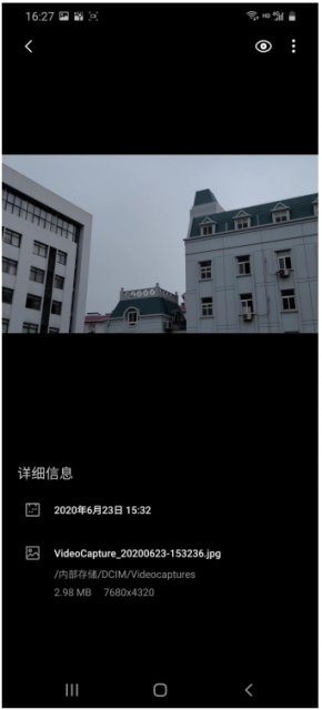 值得一提的是,8K视频快照与我们传统意义上的屏幕截图又有明显不同,屏幕截图一定程度上会降低图片成像质量,但8K视频拍摄可以保持高分辨率,就像实际拍摄的照片一样,通过查看文件信息看到,快照的分辨率高达7680X4320,属于高清范畴,这样的体验也让我们的影像更具可玩性。