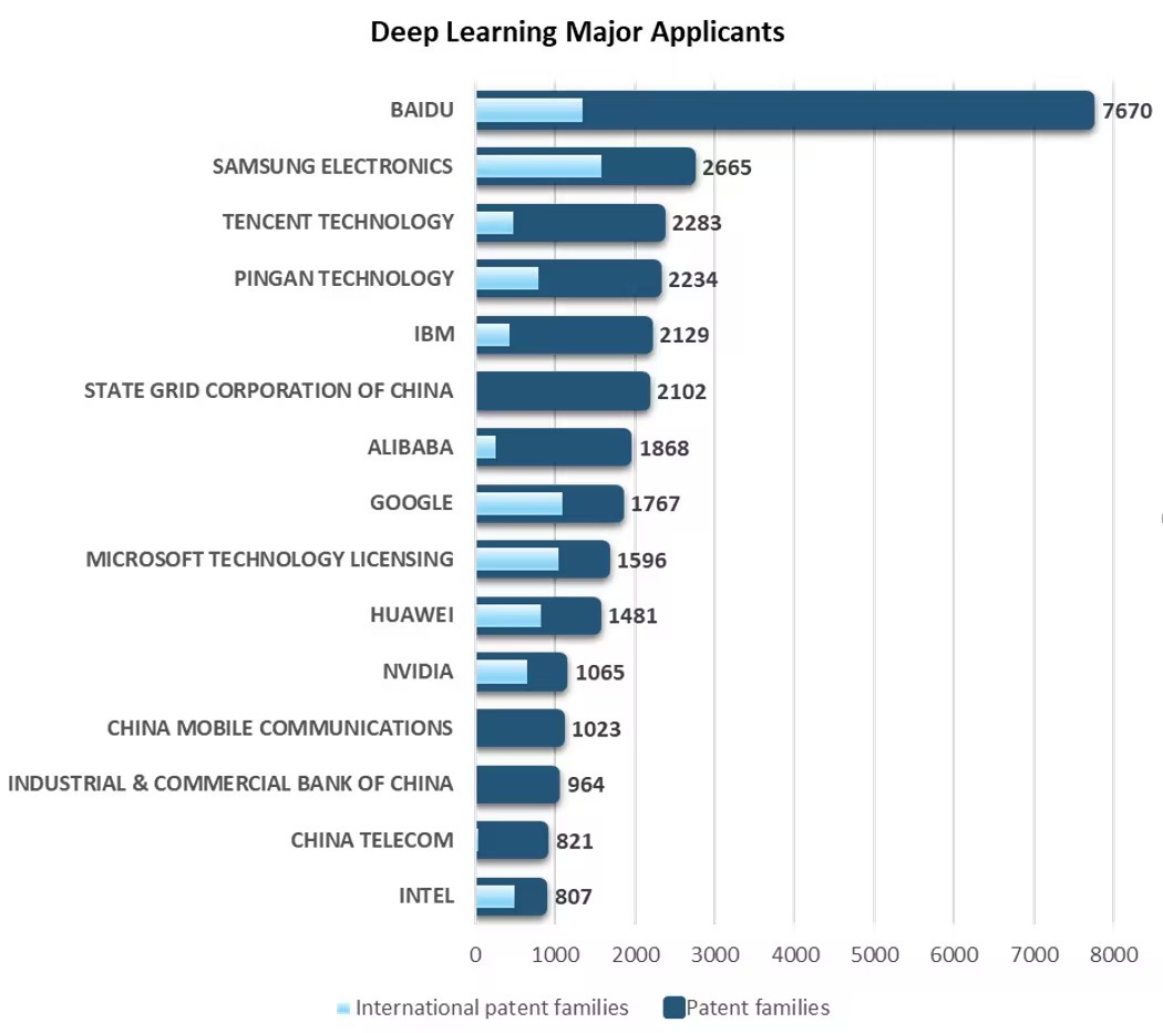 百度持续巩固在深度学习领域的专利领先优势。报告显示,百度深度学习领域专利申请量达7670件,稳居全球第一,并连续三次蝉联该领域专利申请量榜首。