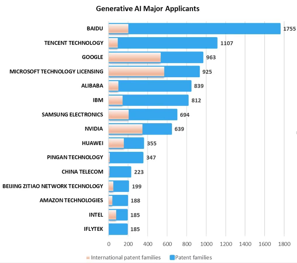 Questel报告显示,在生成式AI专利领域,百度以1755件相关专利申请量登顶全球榜首。
