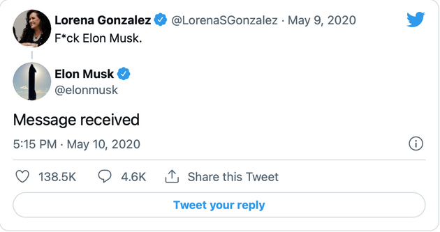 加州州众议员劳伦娜·冈萨雷斯(Lorena Gonzalez)在推特上痛斥特斯拉从加州政府就拿到了10亿美元补贴,却为了自己私利公开违反政府法令和无视工人安全。她还在推特上直接爆粗口,“Fxxk Elon Musk”。马斯克特意回复了这条推文,“收到”。