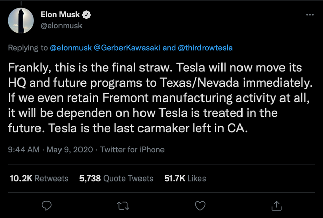 当然,谈到马斯克搬迁特斯拉总部,就不得不提去年5月的那场工厂复工风波。正是在那个时候,马斯克第一次说出要把特斯拉总部从加州搬走。这也是马斯克和加州地方政府矛盾冲突的一个缩影。
