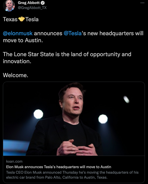 对多年以来一直在和加州明争暗斗的德州来说,特斯拉从加州投入自己的怀抱,无疑是双重胜利:既证明了自己的招商引资能力,又打击了老对手加州政府。在马斯克宣布特斯拉总部搬到德州之后,德州州长阿伯特也在推特上欣喜地表示,欢迎特斯拉来到德州,孤星之州是充满机遇与创新的土地。