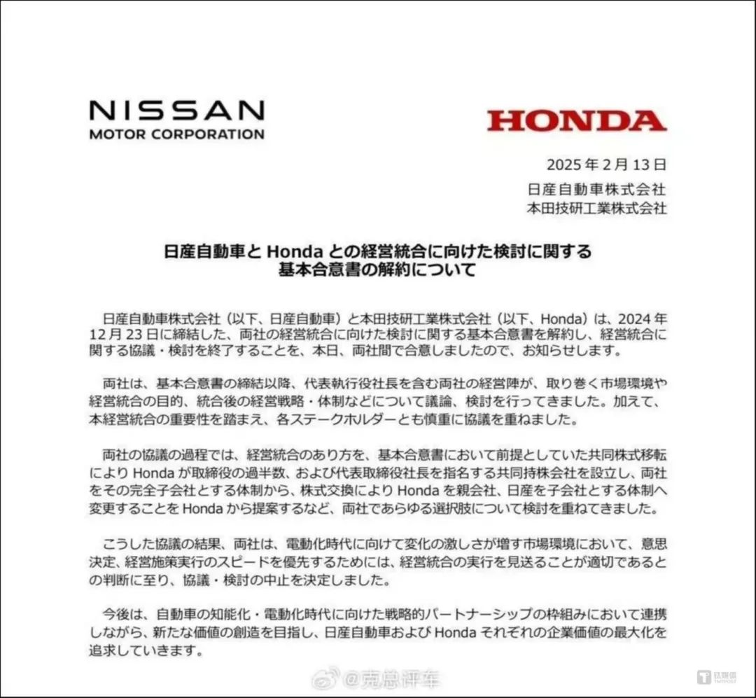 2月13日,本田和日产两家公司发布联合声明,宣布两家公司已终止于2024年12月23日达成的有关业务整合考虑的谅解备忘录,与三菱汽车签署的有关三家公司合作的谅解备忘录也将被终止。不过,2024年8月1日达成的智能和电动汽车战略合作伙伴关系将继续延续。