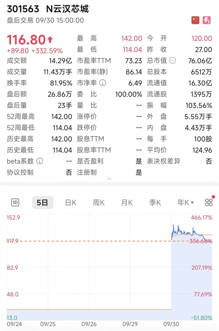 【TechWeb】9月30日消息,今日,云汉芯城(上海)互联网科技股份有限公司在深圳证券交易所创业板成功挂牌上市,股票代码为301563,发行价27元/股,首日开盘价达120元/股,涨幅高达344.44%。截至收盘,云汉芯城股价涨近333%,报116.8元,总市值76亿元。