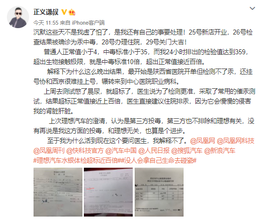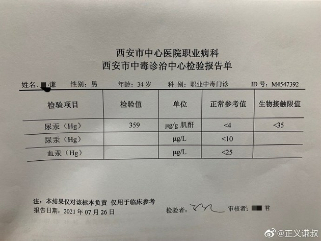 7月30日下午消息,今日,理想水银事件当事人 @正义谦叔 在其个人微博发布检查报告结果。检查结果显示,@正义谦叔 被确诊为汞中毒。 @正义谦叔 表示,”普通人正常值小于4,中毒标准小于35,而我24小时排出的检验值达到359,超出生物接触极限,就是中毒标准10倍,超出正常值接近百倍。“