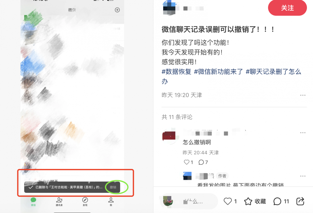 近日,多位网友发帖称,微信聊天记录误删后可以撤销了,不怕手滑删错。